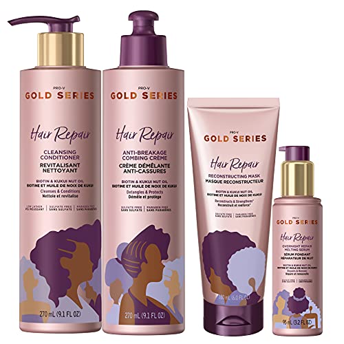 Pantene Gold Series Hair Mask, Anti-Breakage Combing Crème, Overnight Repair Serum, and Cleansing Conditioner, with Biotin & Kukui Nut, for Natural, Curly and Coily, Textured Hair, 815 milliliters