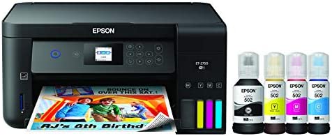 The Eco Tank ET-2760 offers Cartridge-Free Printing with easy-to-fill supersized ink tanks You can save up to 90 percent with low-cost replacement ink bottles ― costing as little as 1 cent per color ISO page versus 20 cents with ink cartridges (1) Plus you can get up to 2 years of ink with the included or a replacement ink set (2) Each replacement ink bottle set includes enough ink to print up to 7 500/6 000 pages (bk/clr)(3) ― equivalent to about 80 individual cartridges (4) That means less waste and fewer trips to the store Exclusive uniquely keyed Eco Fit bottles make it easy to fill each color tank You also get auto 2-sided printing and copying a 1 44" color display and wireless connectivity *The NPD Group Total Channel Tracking Service U S & Canada Inkjet SF/MF Printers Refillable ink tank included based on units February 2019 - January 2020 Supertank printers are defined as refillable ink tank printers 1 Savings and cost per ISO page are based on the cost of replacement ink bottles and the cost of enough standard cartridges to achieve the total page yields of the bottles using the MSRP (USD) and yields for Epson standard-capacity ink cartridges for similarly featured Epson consumer inkjet printers as of February 2019 Actual savings and costs will vary considerably based on print tasks print volumes and usage conditions 2 Based on average monthly document print volumes of about 150 pages 3 Part of the ink from the included bottles is used for initial setup yields are lower than those of replacement ink bottles Replacement and included ink bottle yields based on the ISO/IEC 24712 pattern with Epson’s methodology Actual ink yields will vary considerably for reasons including images printed print settings temperature and humidity Yields may be lower when printing infrequently or predominantly with one ink color All ink colors are used for printing and printer maintenance and all colors must be available for printing For more information visit our official site 4 Individual cartridges estimate based on print yields of a replacement set of Black and color ink bottles as compared to Epson standard-capacity ink cartridges for similarly featured printers as of September 2018 5 Most features require an Internet connection to the printer as well as an Internet- and/or email-enabled device For a list of Epson Connect enabled printers and compatible devices and apps visit our official site 6 Wi-Fi CERTIFIED level of performance subject to the range of the router being used Wi-Fi Direct may require printer software 7 Adapter may be required 8 Voice-activated printing is not available with the Epson Expression Eco Tank ET-2500 and ET-2550 printers and Epson printers that are 5 or more years old See our official site for device compatibility Epson Connect account and voice-activated account registration required 9 12 months of standard limited or 50 000 plain paper sheets (whichever happens first) For an additional 12-month extended service plan (total of 24 months or 50 000 plain paper sheets whichever happens first) you must register your product and use Epson genuine ink bottles See Limited for details 10 ET-2600/2700/3700/4700/7700/16000 Series and ST-2000/3000/4000 Series included ink bottle yields based on the ISO/IEC 24712 pattern with Epson’s methodology ET-7700 Series included ink bottle photo yields are significantly lower ET-8700 included ink pack yields are estimated based on ISO/IEC 24711 test in Default Mode printing continuously Actual ink yields will vary considerably for reasons including images printed print settings temperature and humidity Yields may be lower when printing infrequently or predominantly with one ink color All ink colors are used for printing and printer maintenance and all colors must be available for printing For more information visit our official site 11 For convenient and reasonable recycling options visit our official site 12 Smart Way is an innovative partnership of the U S Environmental Protection Agency that reduces greenhouse gases and other air pollutants and improves fuel efficiency.