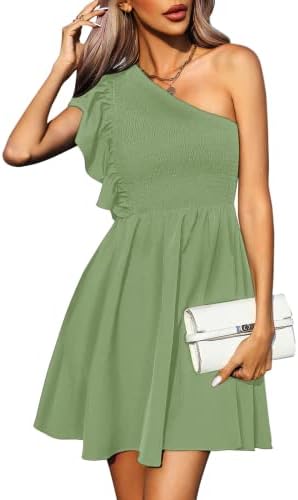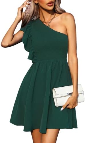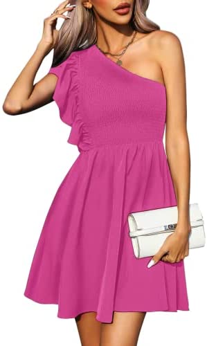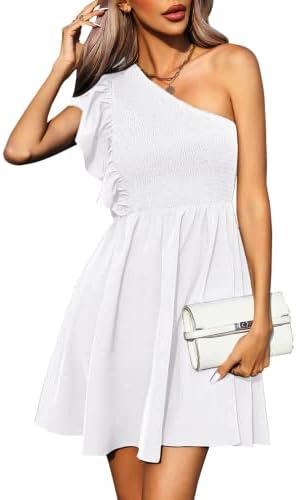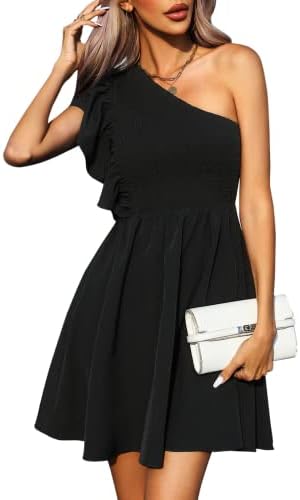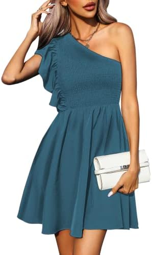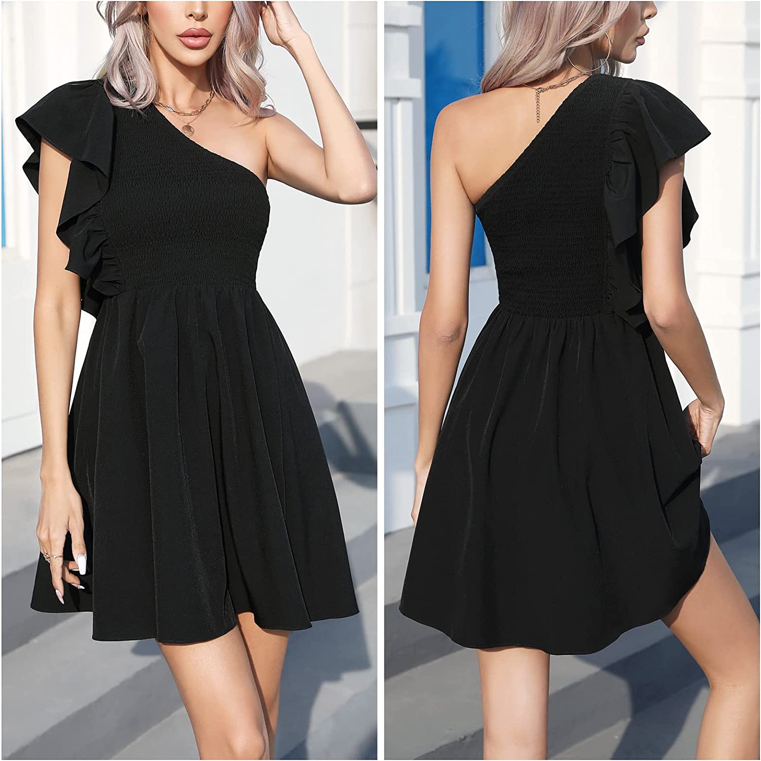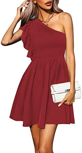 Features: one shoulder, sleeveless, ruffle sleeve, smocked stretchy bodice, high waist, skater dress, lining, solid color, fit and flare mini dress.