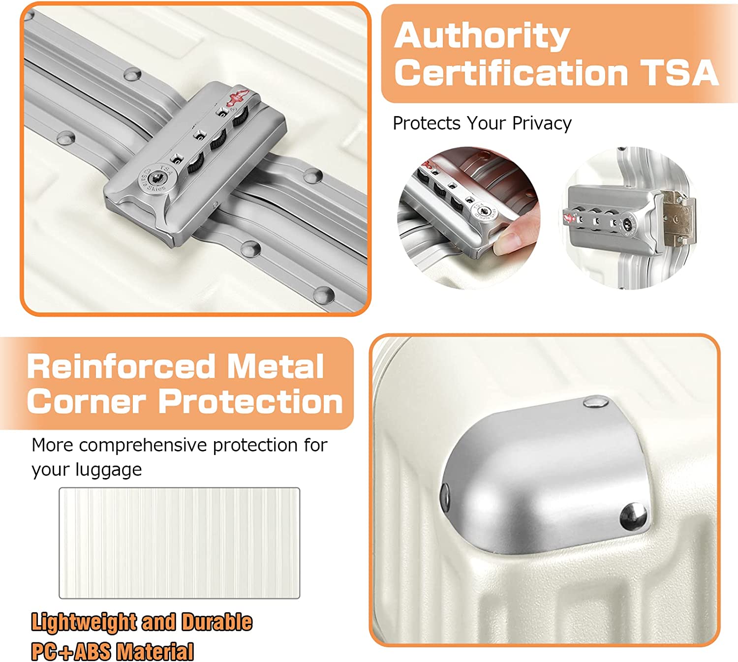 • 【4 Metal Corner Guards】The four corners of the luggage have 100% aluminium corner guards to further protect your luggage, even if the luggage is subjected to strong impacts, he can provide further protection and increase the usage time of the case.