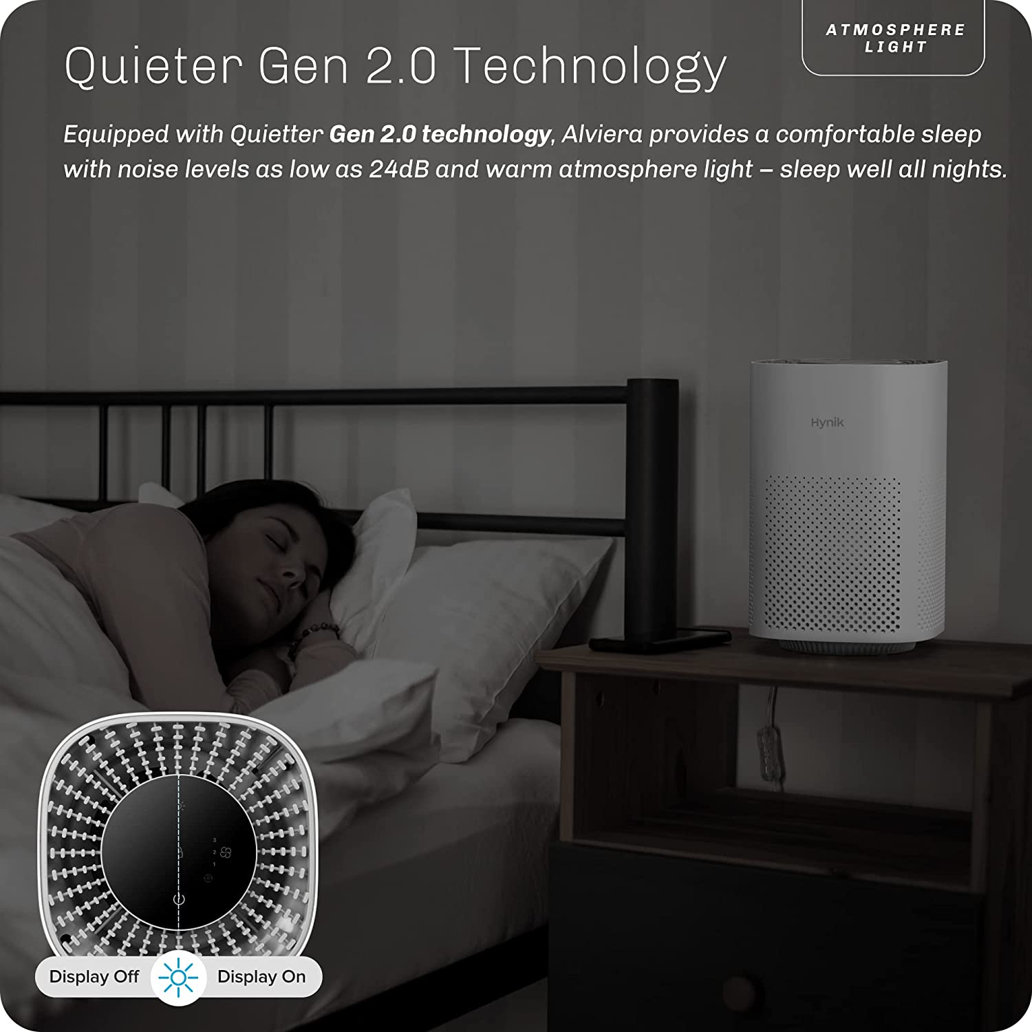 • Quietter Gen 2.0 TECHNOLOGY: Meets the strictest requirements set by the EPA. 24/7 guilt-free clean air! Built-in advanced Quietter Gen 2.0 noise reduction technology, maintains 24db noise at the lowest speed, ensuring Alviera won’t disturb your sleep.