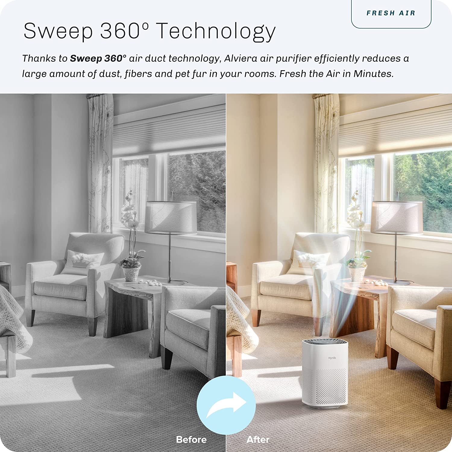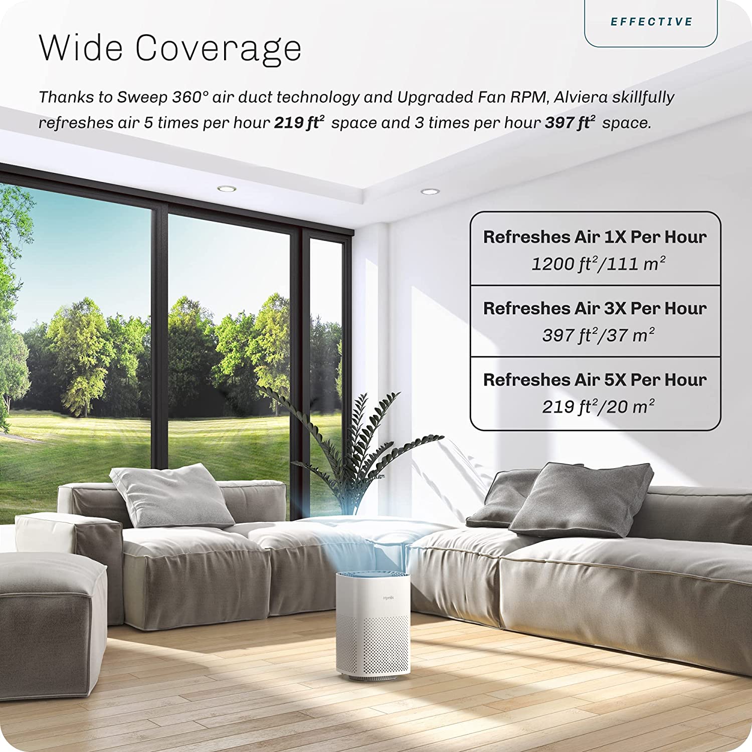 • Smart Choice for Small Rooms: Fits anywhere and features a wide coverage with SWEEP360° air-duct design. Alviera refreshes the air 5 times per hour in rooms as large as 219 ft² / 20 m², 3 times per hour in rooms as large as 397t² / 37 m², especially for bedroom. Sweep360° TECHNOLOGY - Reduces air loss by 32% and increases air intake by 47%. It's faster to purify your room.