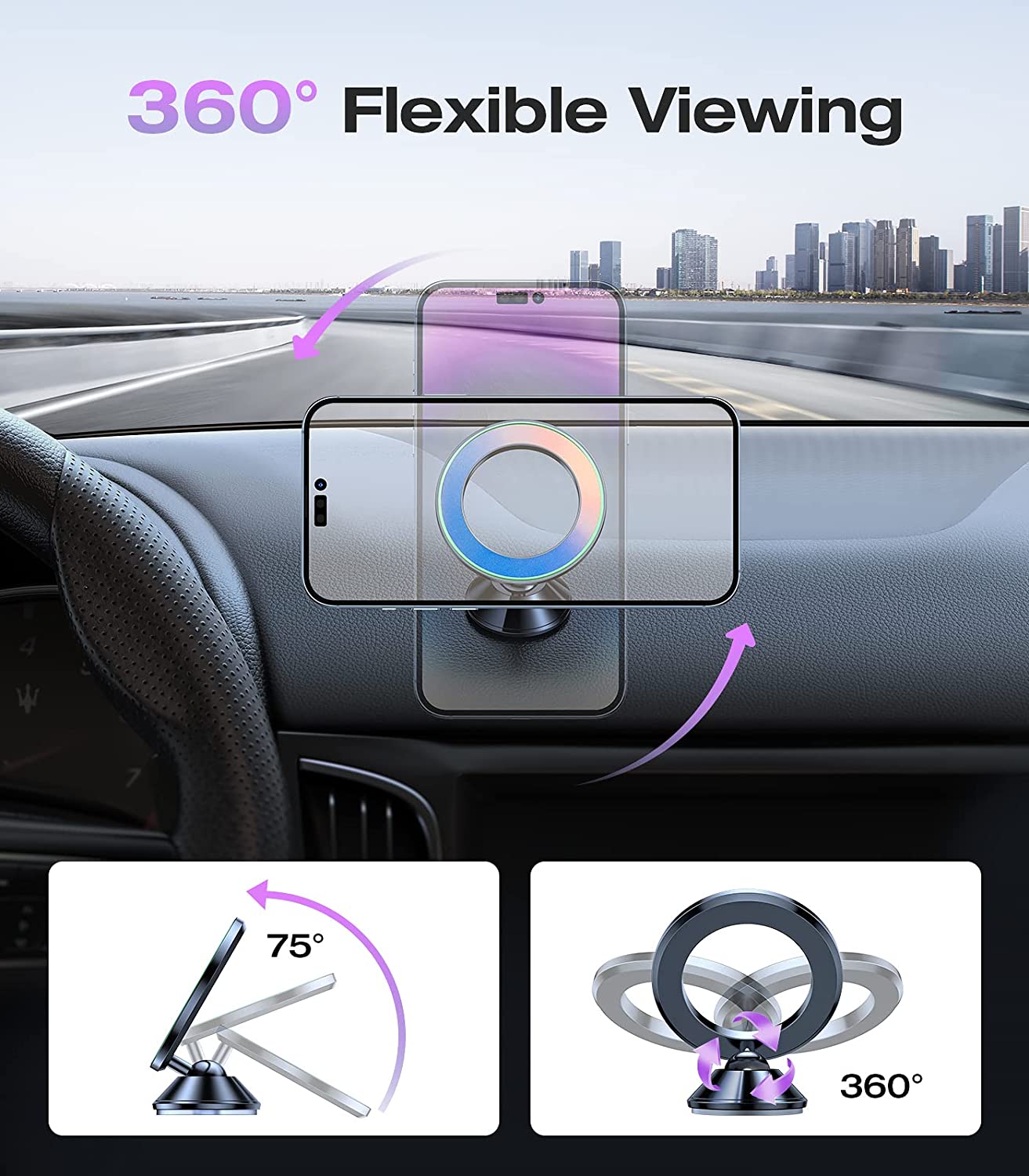 • ?Small and 360° Flexible - As the lightest magnetic car cell phone holder on the market, you can install it anywhere. It doesn't take up space in your car or obstruct the view, easy adaptation into any car. The iphone magsafe car mount has a 360-degree omnidirectional adjustment ball joint, you can twist the magnetic ring panel to set the orientation of your phone arbitrarily, ensuring that your phone is always at the angle you like
