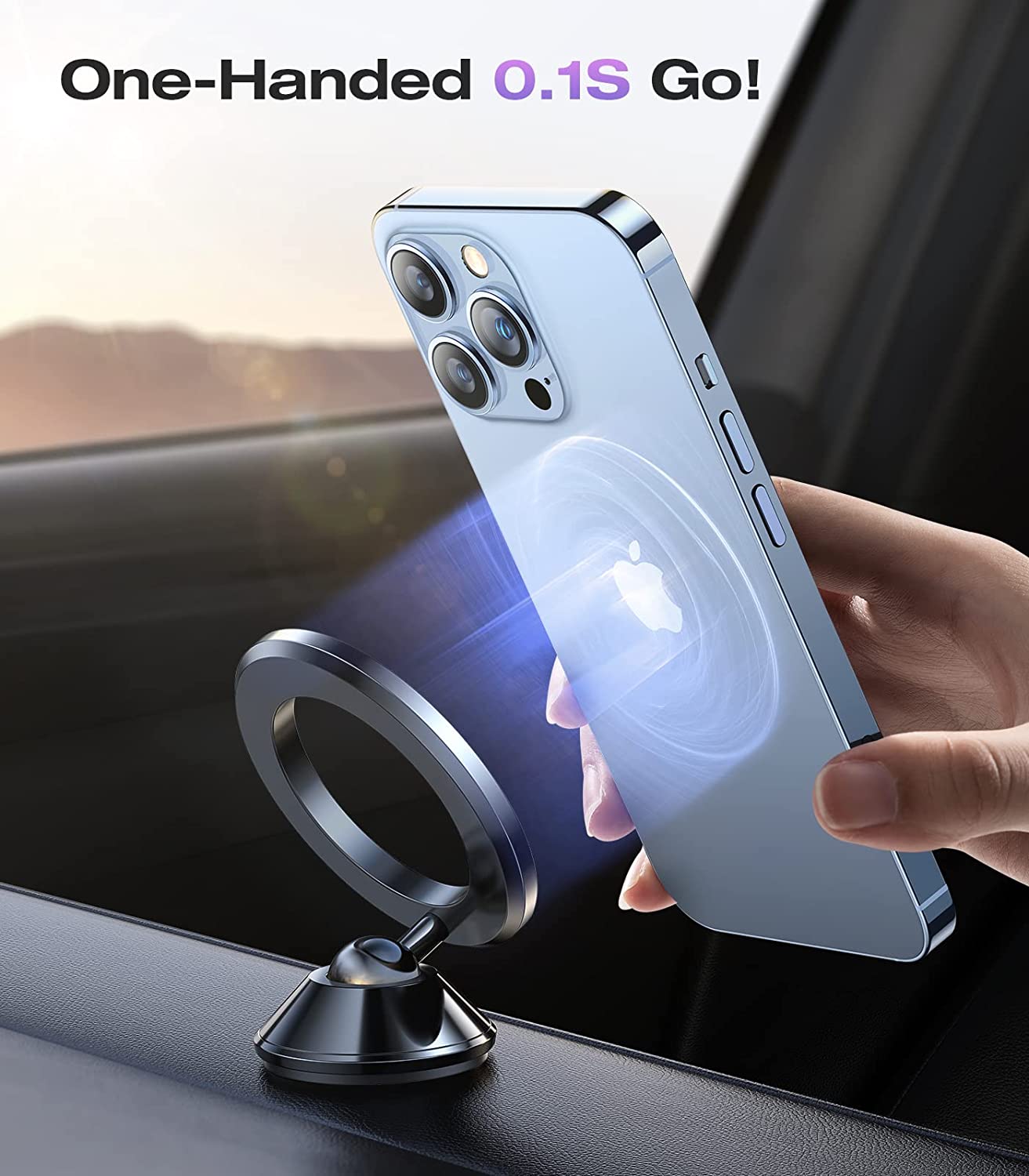 • ?Designed for Magsafe Precisely - Most stylish iphone car holder magsafe in 2022 is specially designed for iPhone12/13/14 Pro Max Mini & official MagSafe cases & other magnet cases, which can attach these phones directly without the hassle of sticking metal plates. The magnetic car phone mount for iphone will automatically aligns and snaps to your iPhone, just need you make 1 placement motion with 1 hand to use, saving your precious time