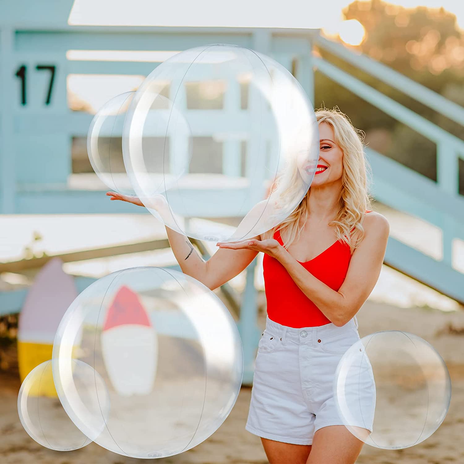 Clear Beach Balls: the inflatable beach balls are clear design, which is beautiful and attractive especially under the sun or spotlight, easy to catch most boys and girls' attention and cater to their tastes