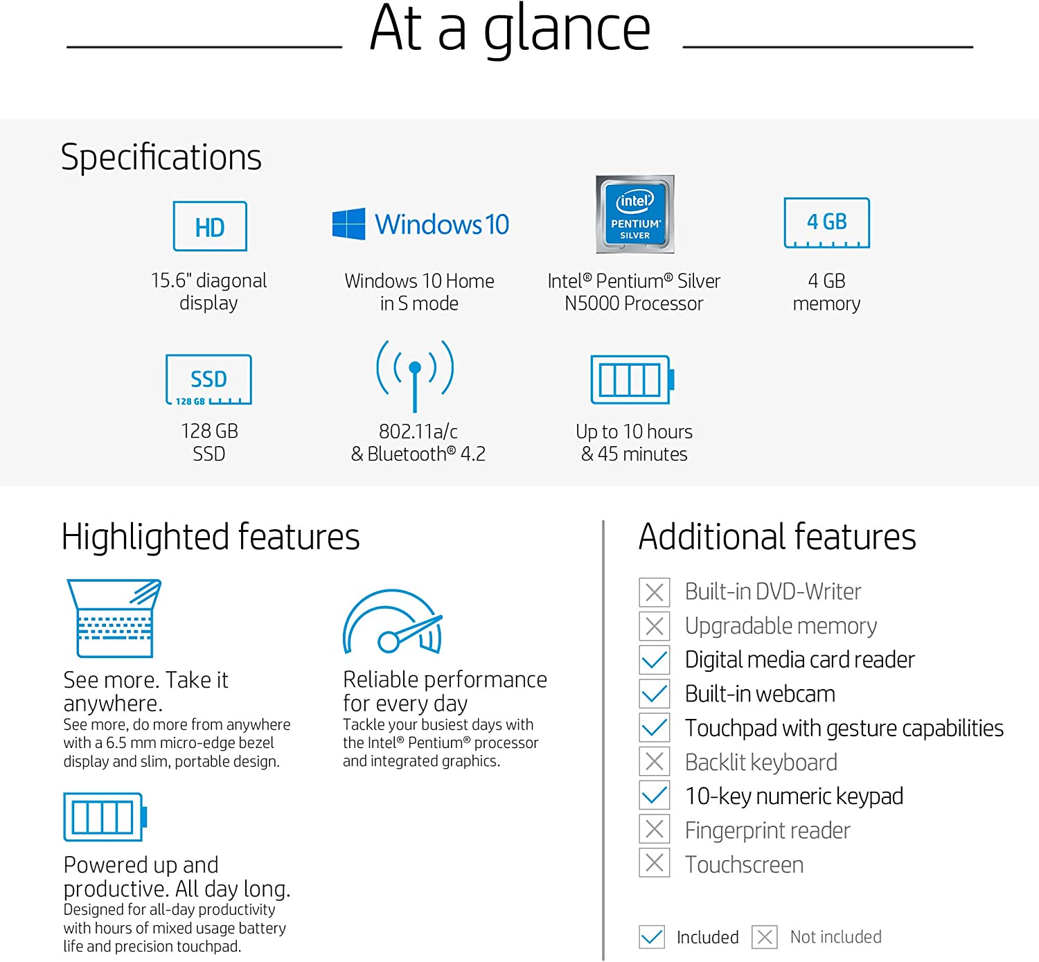 • 15.6" diagonal, HD (1366 x 768), micro-edge, BrightView, 220 nits, 45% NTSC, Intel Pentium Silver N5000 (1.1 GHz base frequency, up to 2.7 GHz burst frequency, 4 MB cache, 4 cores)
