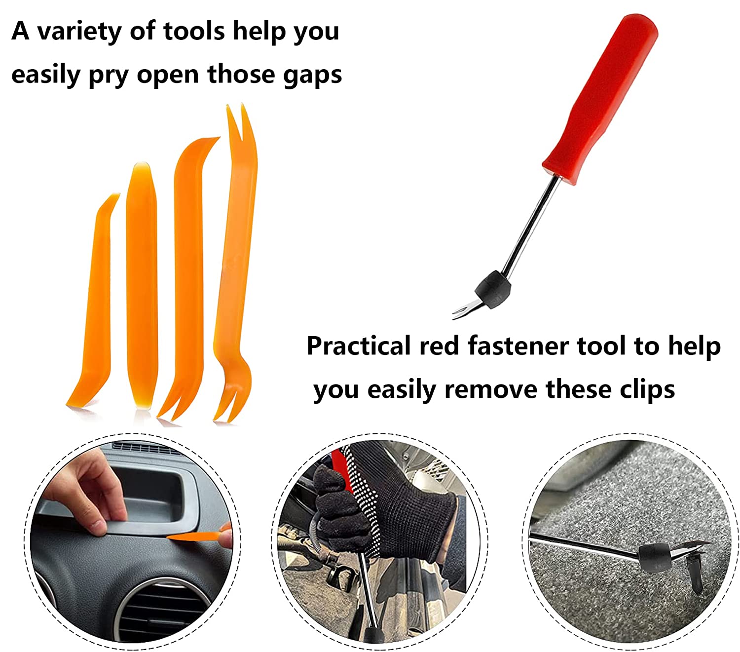 【HIGH QUALITY CLIPS AUTOMOTIVE】--The plastic rivets and trim removal tool are made of premium nylon material can be used for a long time. Durability will not damage or break easily during use.