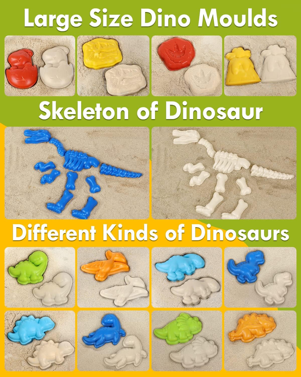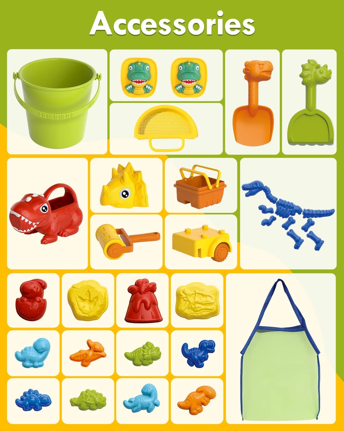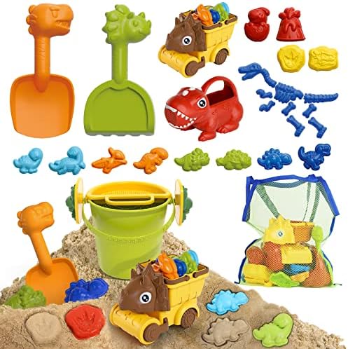 • 34 PCS super value Dinosaur beach toys: Sand toy set consists of 10 Dino Bone Molds, 8 Dino Sand Molds, 4 Dino Combinations, 1 Triceratops (can be split into 4 tools), 1 Sand Bucket(2 dino lugs+1 mesh sieve), 1 Dino Shovel, 1 Dino Rake, 1 Dino Watering Can, 1 Mesh Bag. Our beach toys are perfect for a creative day at the beach, or in the sandbox.