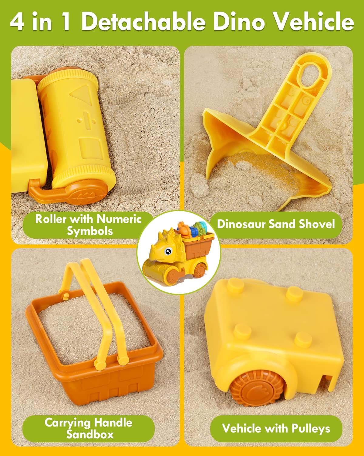 • Encourage kid's creativity: Our kids sand toy includes fun dino molds that will encourage creative play. One of the most characteristic Triceratops sand loading cart can be broken down into 4 parts as 4 different tools for sand play. And with your help, your little one can easily put these 4 parts together. Your child will love this STEM Toy set!