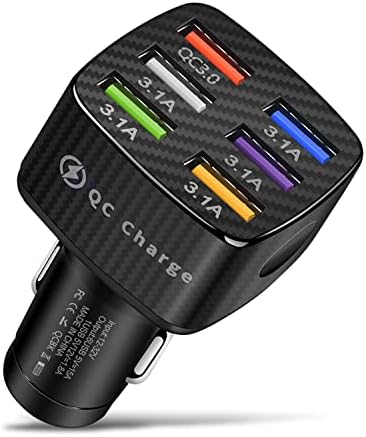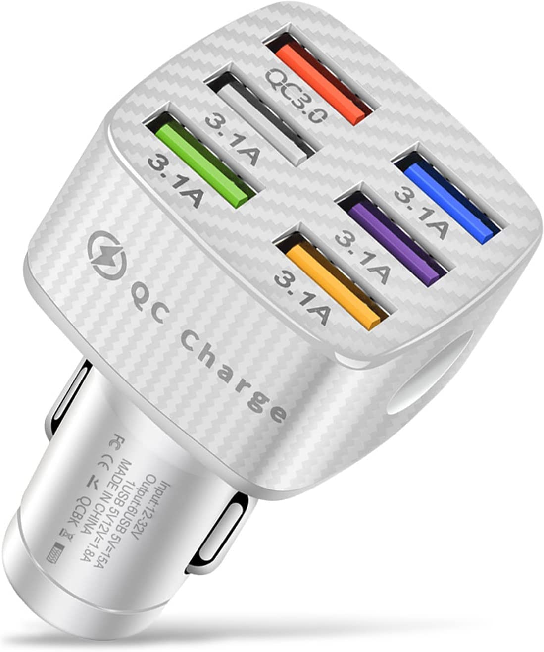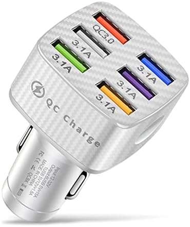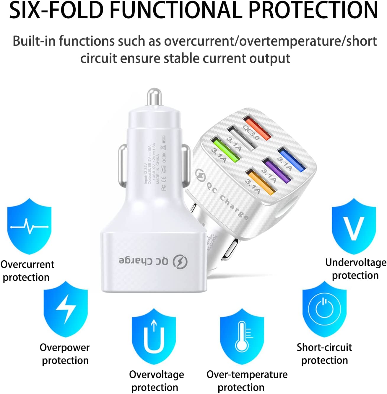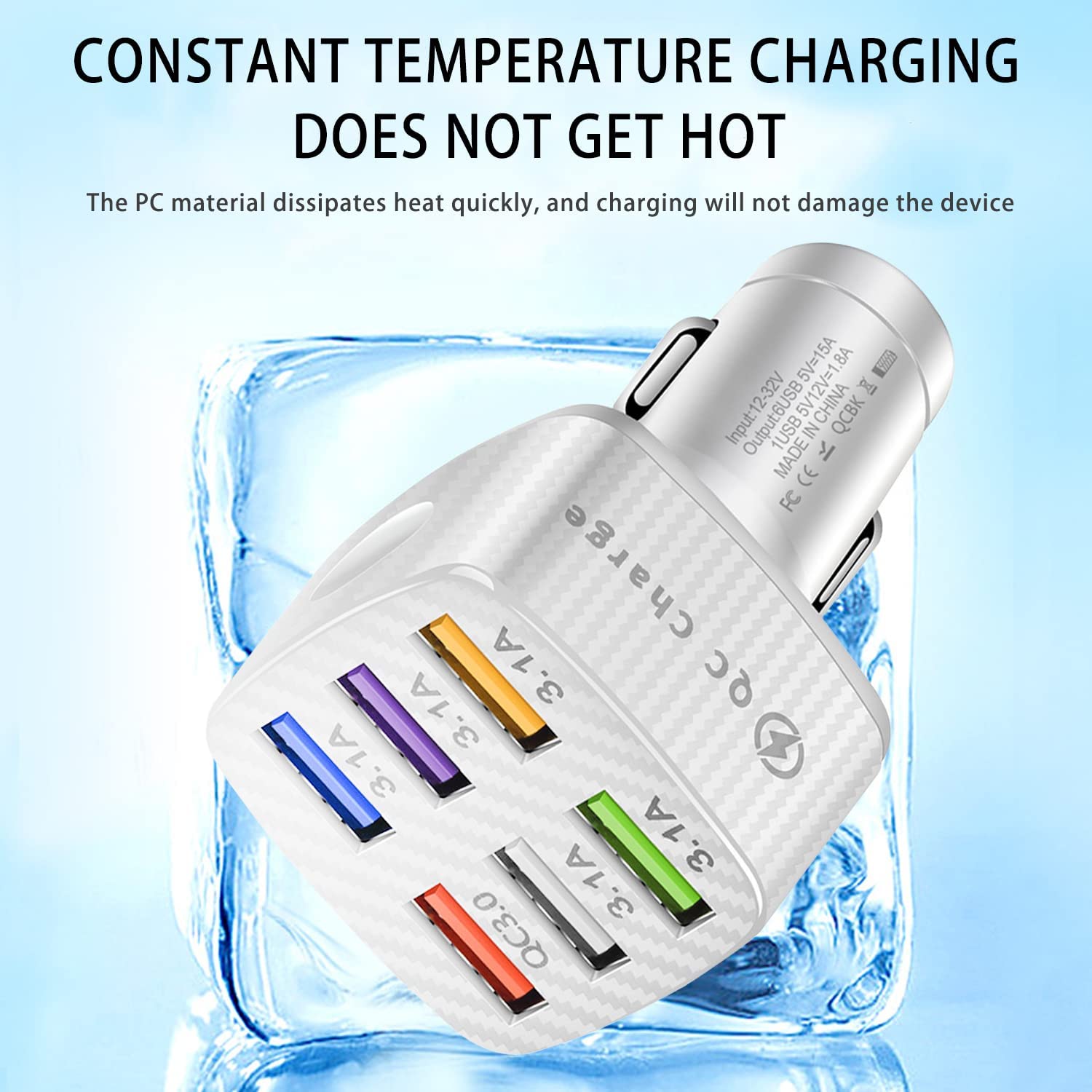 Car Charger Adapter, 6 Ports USB QC3.0 Fast Phone Charger, Car Interior Accessories Fit for All Vehicles, Multi-Port Car Phone Charger with LED Light Display for Smart Phone and More (White)
