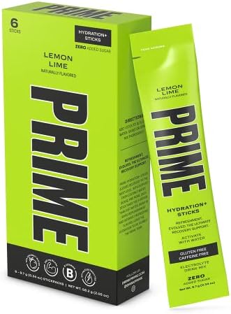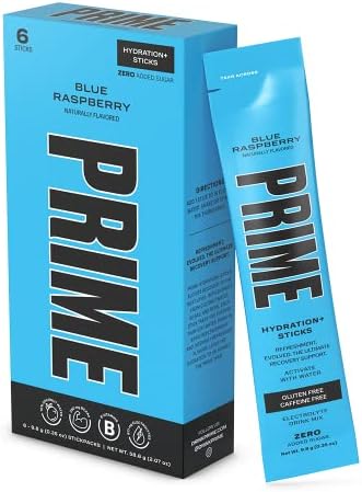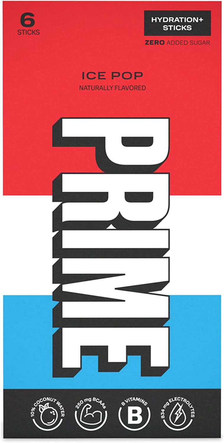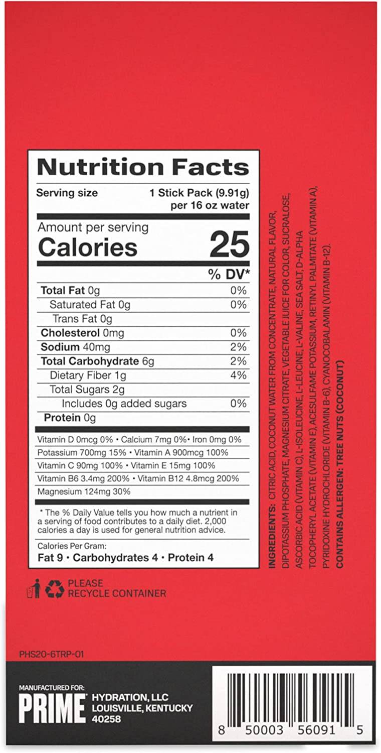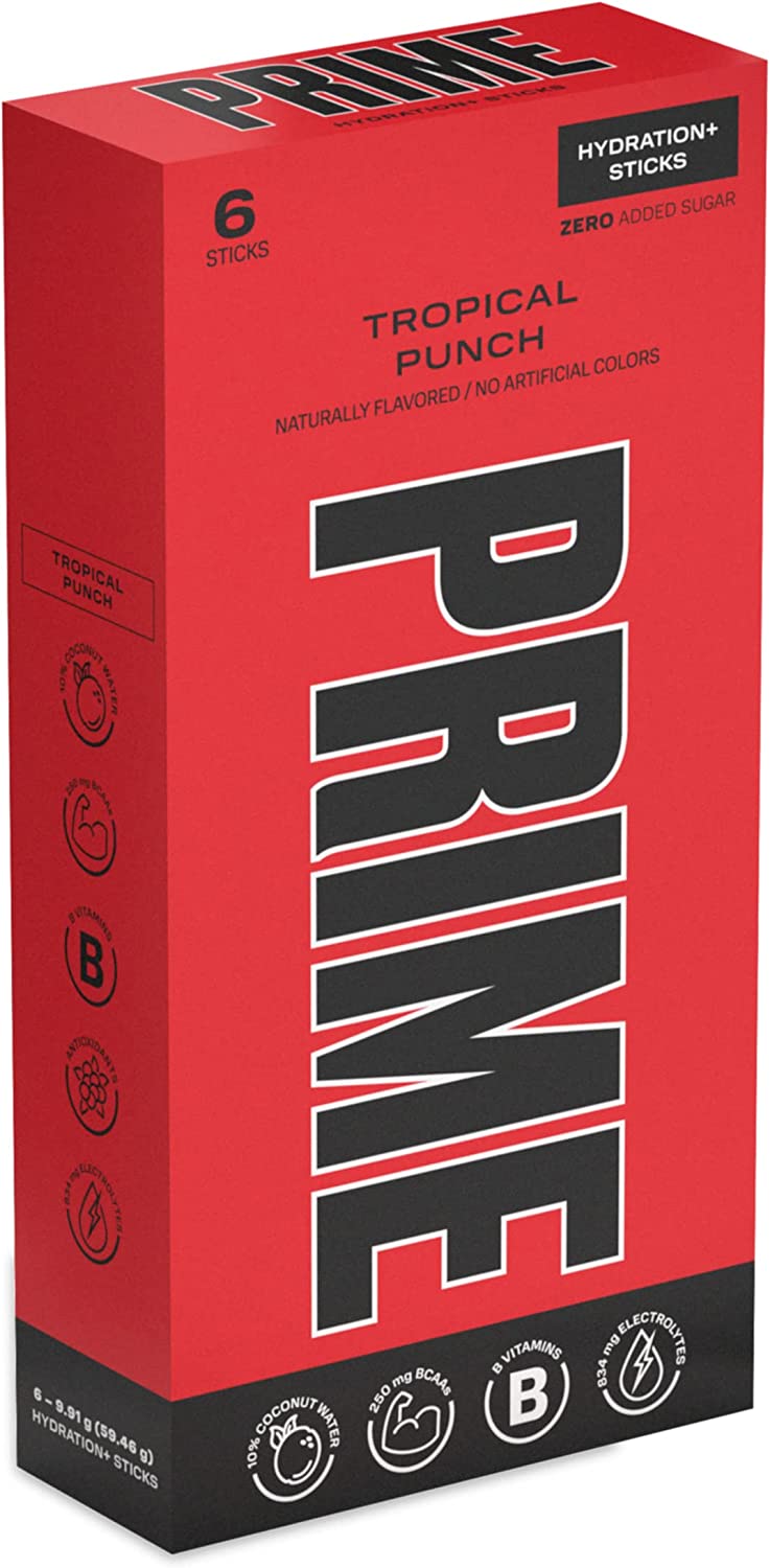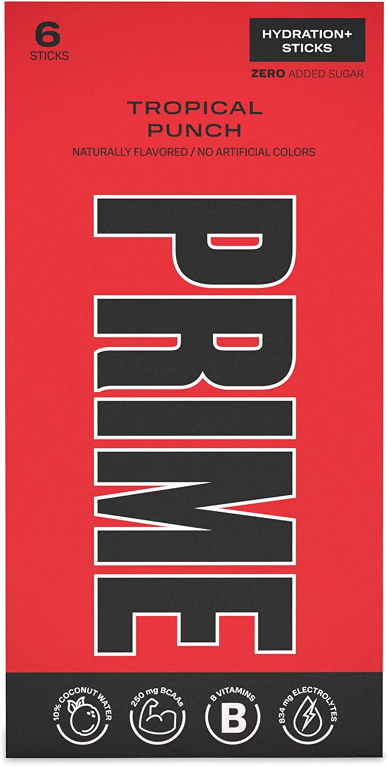 Prime Hydration+ Sticks are only 20 calories per serving with zero added sugar, 250mg BCAA, 834mg electrolytes, B vitamins, antioxidants, and 10% coconut water