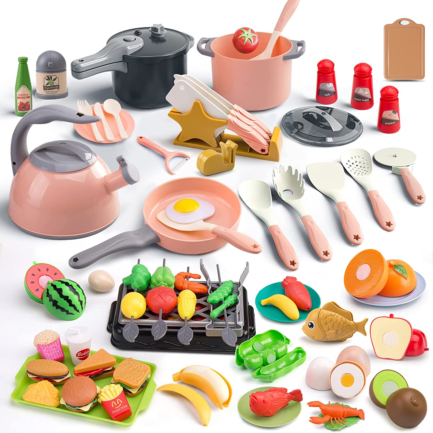 Zero Zoo 105Pcs Kids Kitchen Toy Accessories, Toddler Pretend BBQ Camping Cooking Playset with Play Pots and Pans, Utensils Cookware Toys, Play Food Set, Toy Vegetables, Learning Gift for Girls Boys