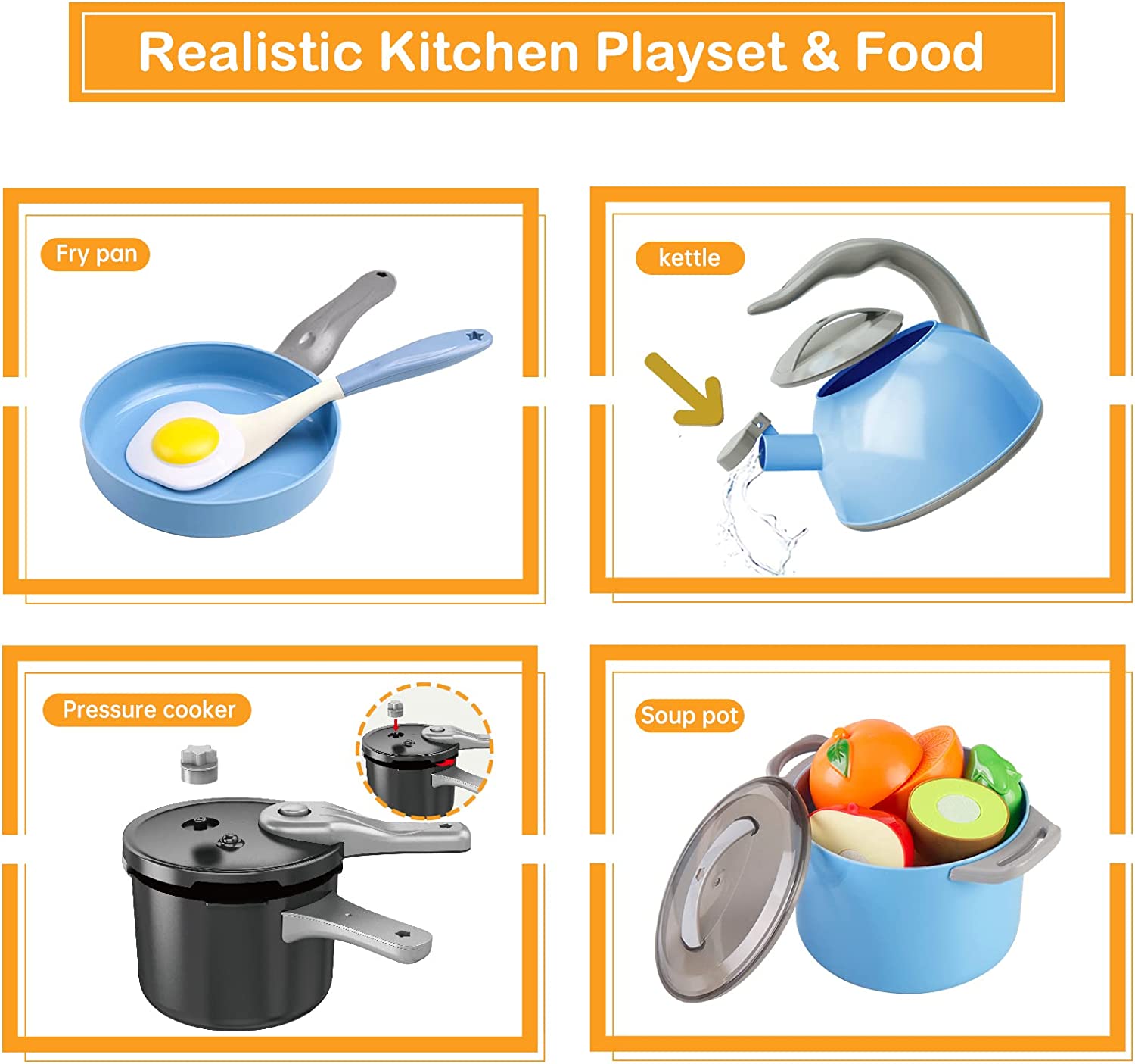 • 【Realistic Kitchen Playset & Cuttable Food】Realistic cooking set encourages imagination, dexterity, and creative play, Teaches your little ones to be mother's little helper. The kettle can be filled with water and the spout can be pulled out, Give your child a gift that creates countless happy moments!