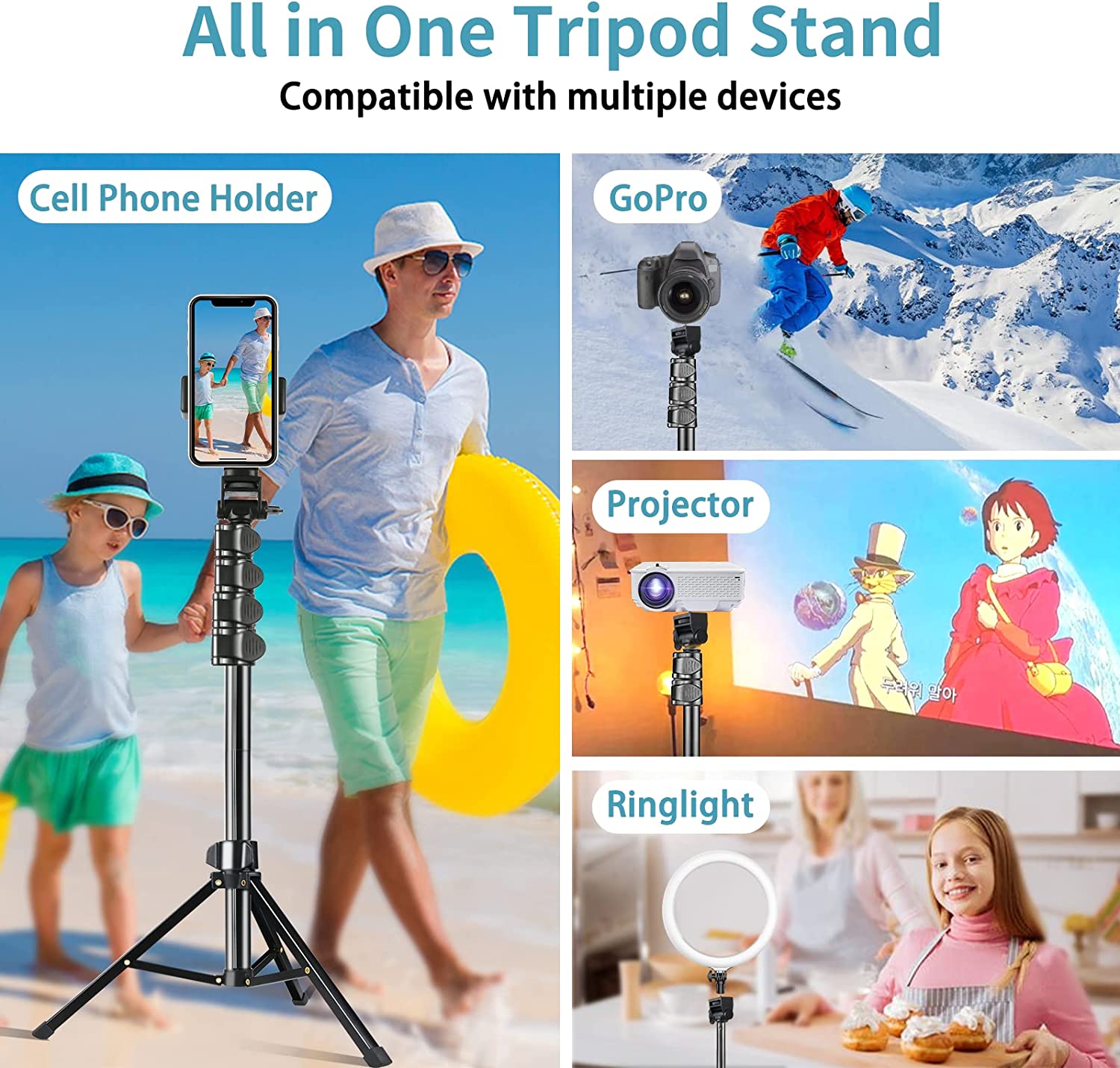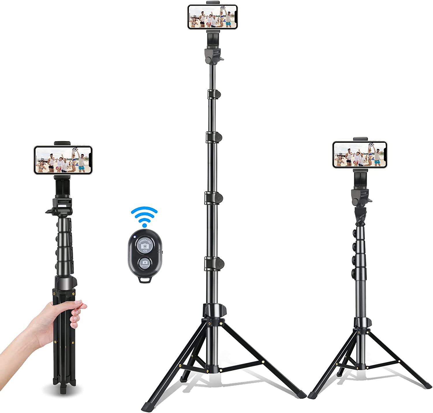 • 【67'' ADJUSTABLE HEIGHT & PERFECT ANGLE】 Twisting to lock & extendable 67-inch cell phone stands for a Phone or Camera with 4 sections of the telescopic pole that extend from 18.3 '' to 67'' - adjust the shooting angle, allowing you to shoot heights that other 60'' or 62'' cell phone tripod cannot shoot. 180° neck rotation, you are able to adjust the phone/camera holder vertically or horizontally to any angle you want, you can rotate it smoothly, and it allows the phone to take pictures in a vertical position.