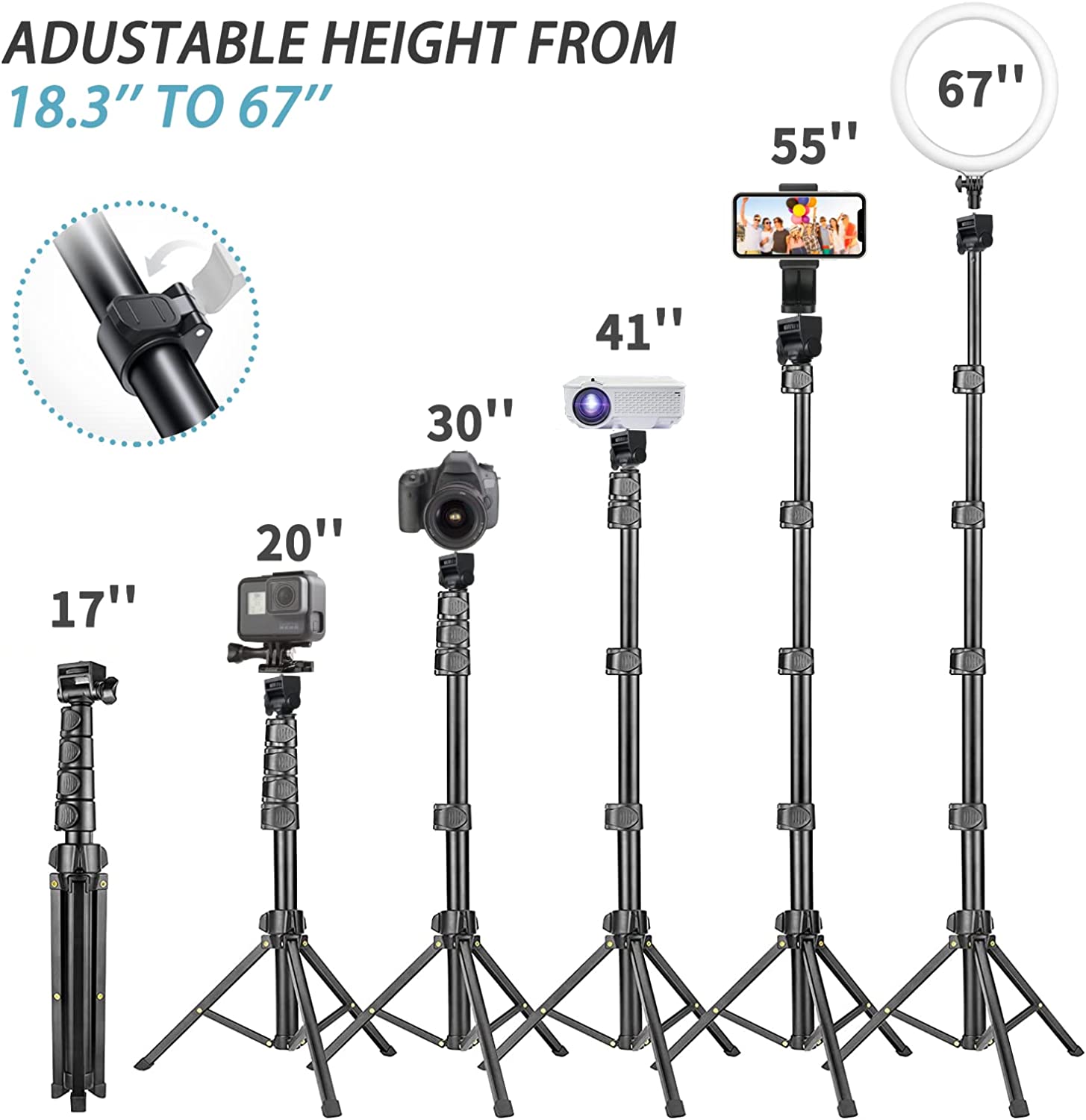 • 【LIGHTWEIGHT AND PORTABLE】 Our phone tripod with lightweight and compact design. The weight only weighs 1.3 lb, simple to carry with an 18.3-inch minimum storage space. You can easily take our phone tripod stand with you anywhere and keep one in your backpack or suitcase, or put it in the carrying bag we provide for you, and start your travel or hiking right now!