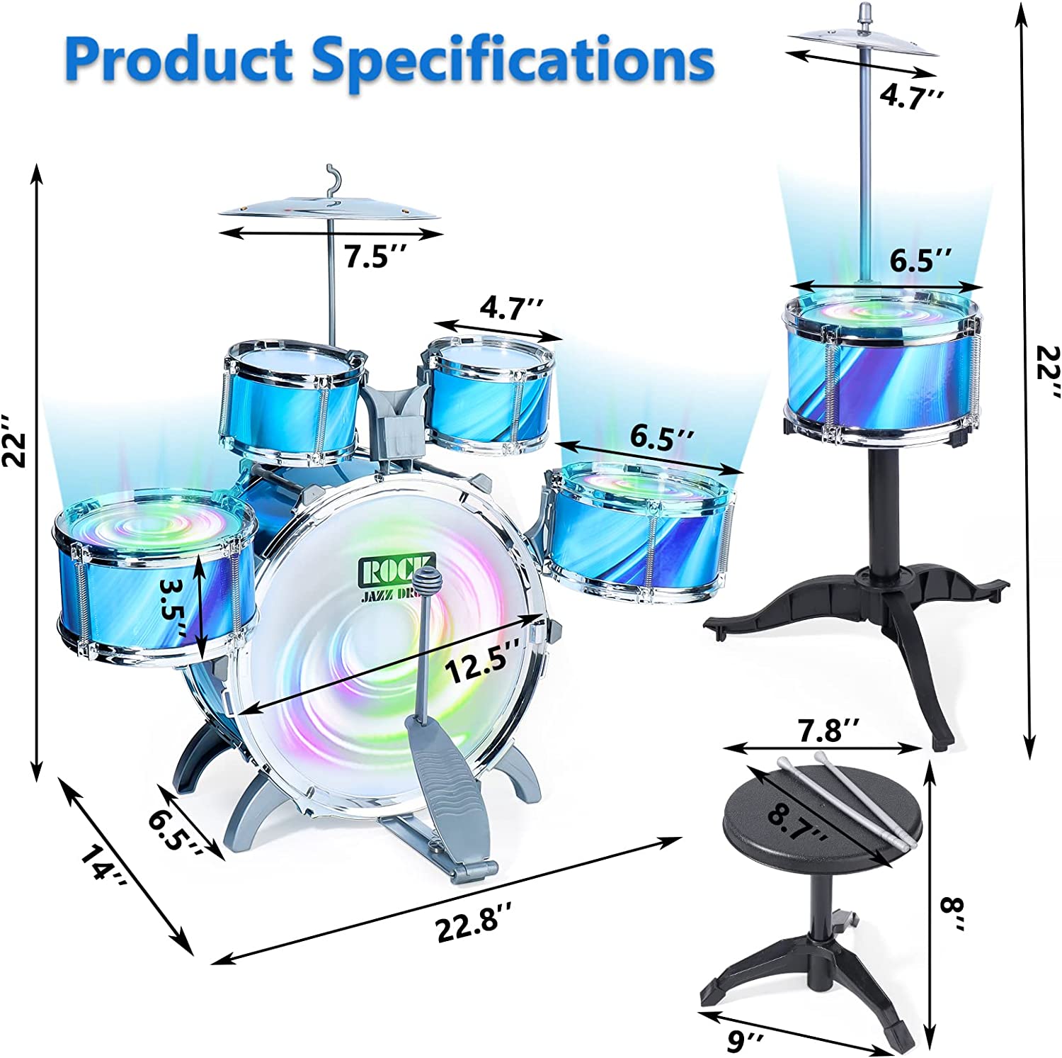 ??15-Piece Jazz Drum Kit — Our drum set comes with a jazz drum, three medium drums, two small drums, two cymbals, a stool, and a pair of drumsticks. It is perfect as beginners in learning and practicing drum. OVERALL DIMENSIONS: 14"(L) x 22.8"(W) x 22"(H).