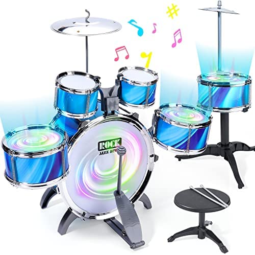 Kids Jazz Drum Set for Toddlers 1-3 (15-Piece), Drum Kit Musical Instrument for Beginner Music Practice w/ 4 Lights, 6 Drums, 2 Cymbals, 2 Drumsticks, Stool (Blue)