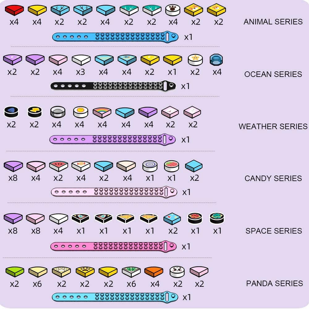 【Building Blocks Dots Bracelets Set】- Each Bracelet is Individual Package! SIENON Dots Bracelets Set includes 6 different series, cat animal, ocean, summer, grape fruit, circus and space theme, suitable for girls and boys age 6+. Each bracelet has 1pc flexible and adjustable silicone band and 23-24pcs colorful tiles, total 142pcs.