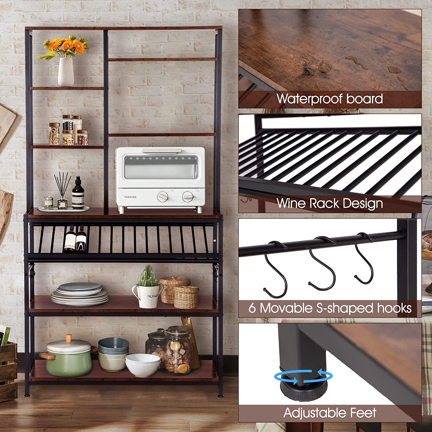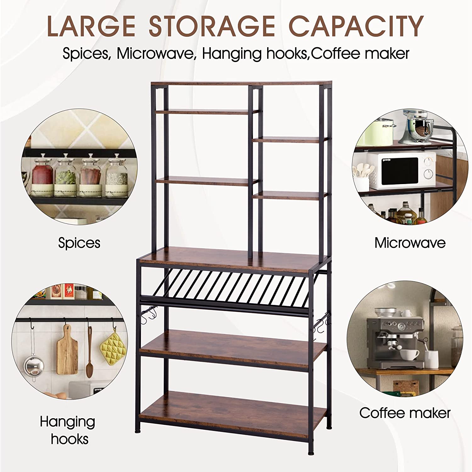 MAISON ARTS Bakers Racks for Kitchens with Storage, Microwave Stand Coffee Bar Station with 6 Hooks Wine Storage, Industrial Kitchen Shelf, Rustic Brown