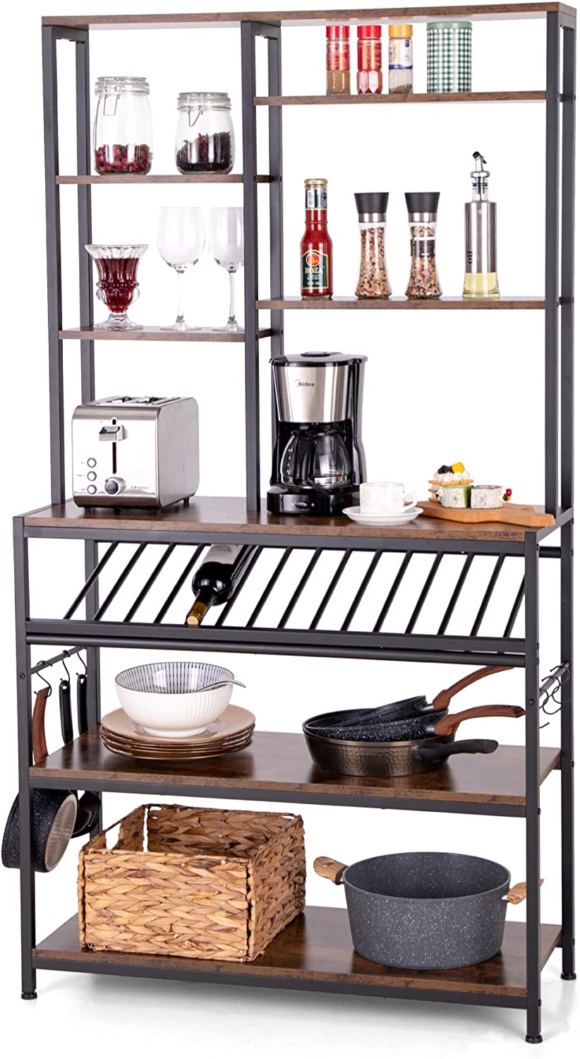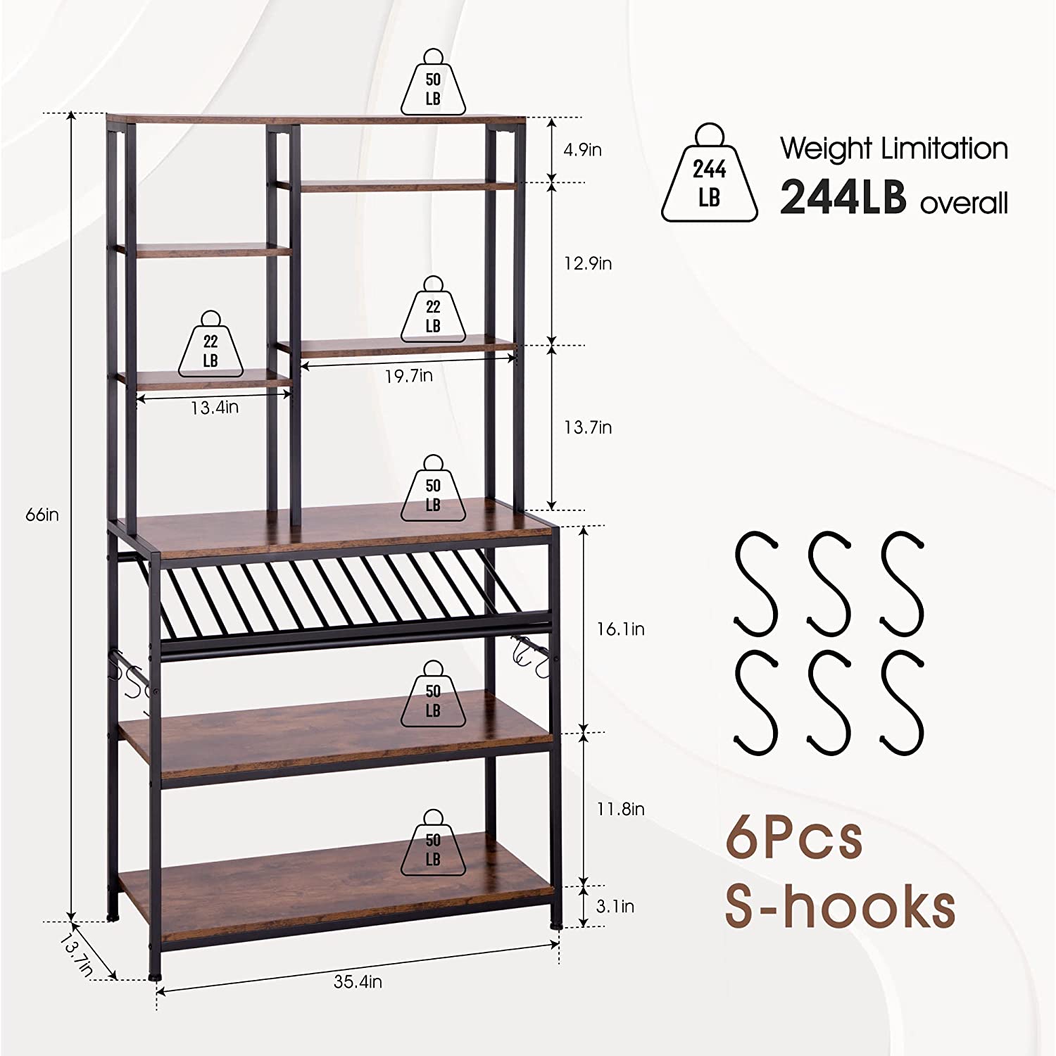 • 【Multiple Storage Space】Our kitchen storage shelf is not only a shelf for ovens, microwaves, coffee pots, toasters and mixers, but also an organizer for other items.The top is for various spice bottles while the bottom is for your tableware and cookware etc.Removable S-shaped hooks are perfect for hanging cooking tools such as spoons, pans and kitchen towels.