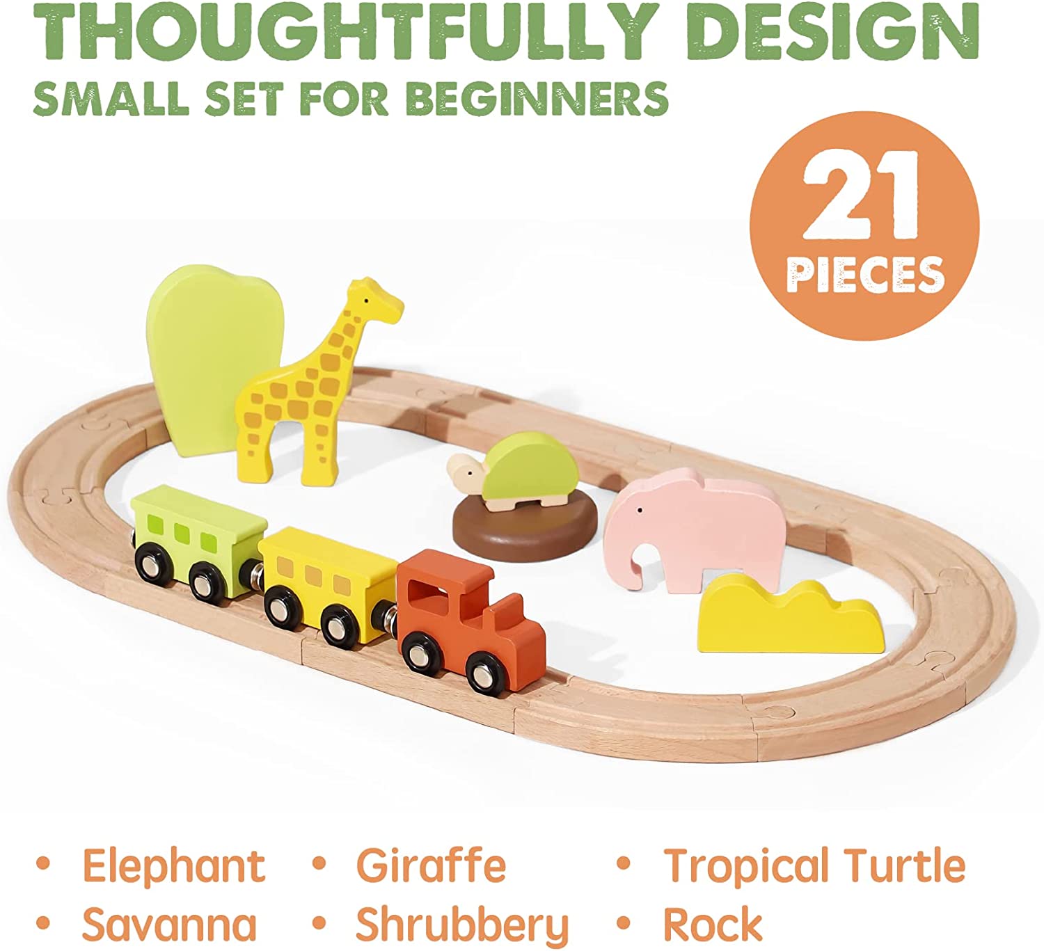 ?Great First Train Set for Toddlers: Storytelling and creative play are never-ending! Explore different shapes of animals with toddler toys, including elephant, giraffe, and Tropical Turtle to encourage children to learn about various colors and animals. Double-Side design wooden train tracks help to motivate kids' creativity and hands-on skills.
