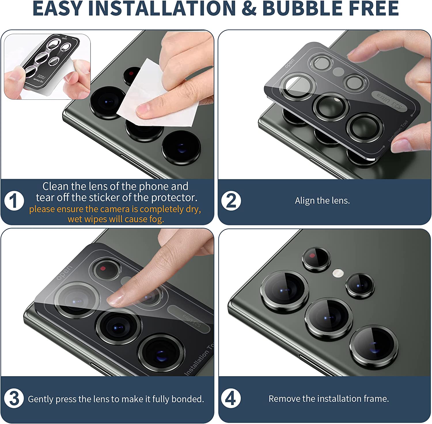 Note! This Listing of Camera lens protector For Samsung Galaxy S23 Ultra ONLY!! Please do not use at the same time with the phone case with its own lens protection. Buy 1 sets you will get: S23 ultra camera lens protector + alcohol bag + dust sticker + removal tool + installation instructions