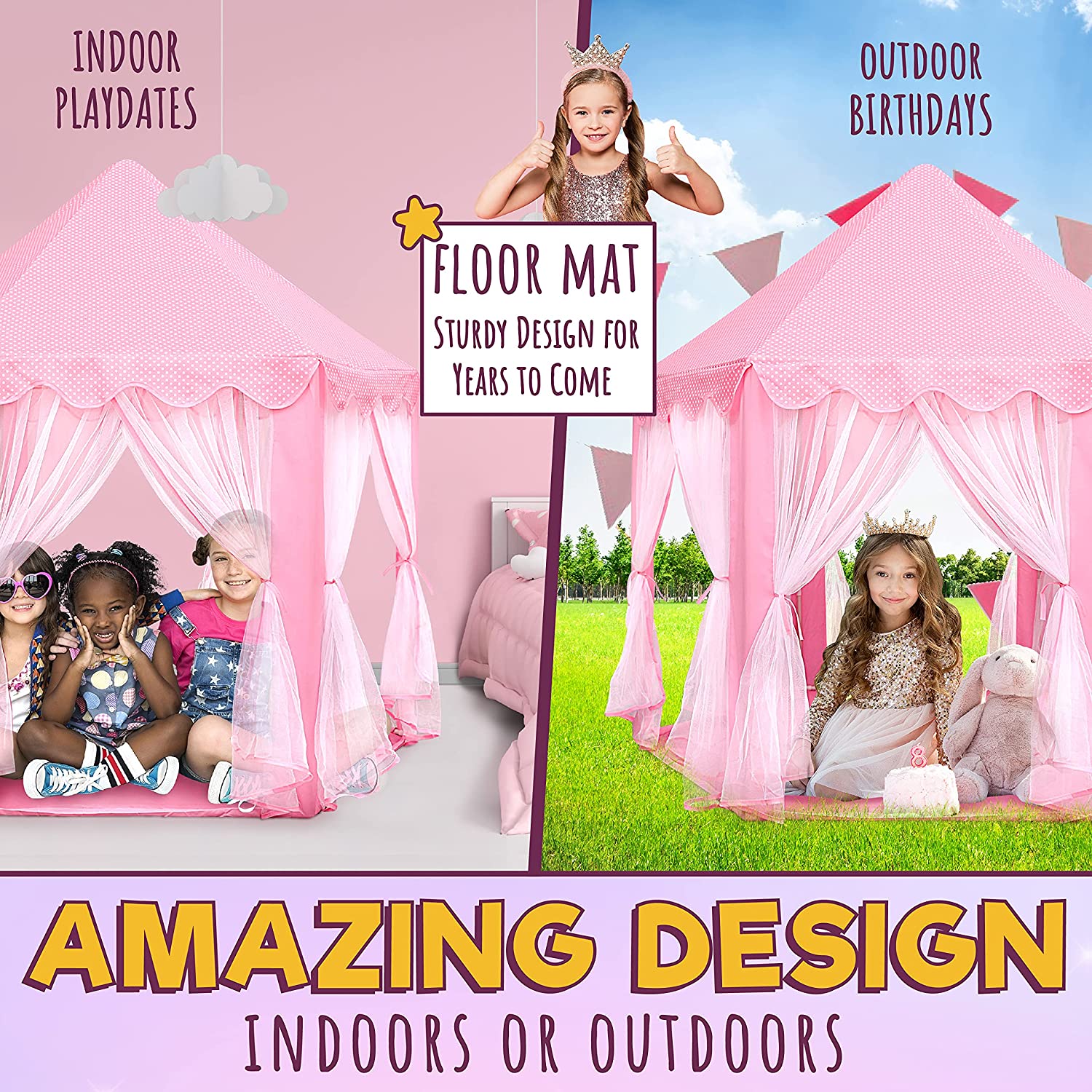 • HIGH QUALITY, DURABLE DESIGN – Made from ultra-thick 230 Polyester Taffeta, this princess tent for kids with lights can withstand all the wear and tear little girls put it through. This material is compatible for both indoor playhouse and kids outdoor playhouse, and will last for years of fun and enjoyment!