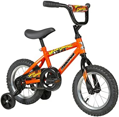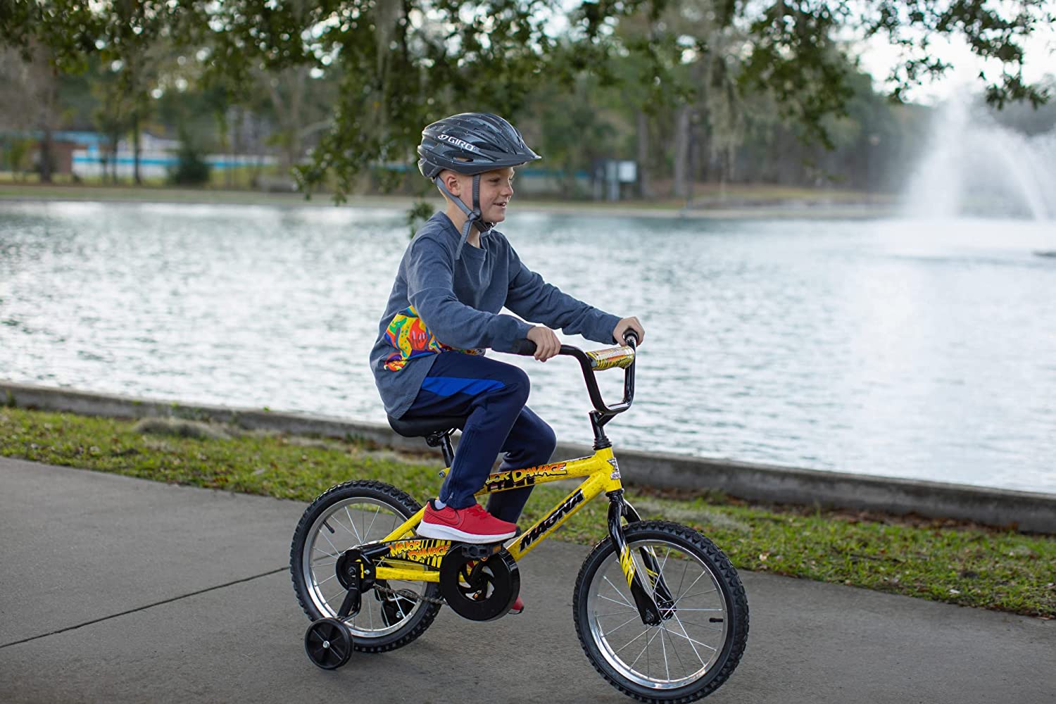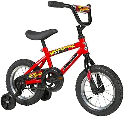 Be awesome, be epic, and cause some major damage! You’re sure to accomplish all three when you ride the Magna Major Damage 12-inch Boys Bike by Dynacraft. This BMX-style frame features a bright blue and black deluxe paint finish, along with eye-catching custom graphics and colorful details on the handlebar pad, frame, and chain guard. Coaster brakes make stopping especially easy and removable/adjustable training wheels provide an extra level of stability until they’re ready to cruise on their own. An adjustable, padded seat also allows the bike to grow with them. The size and design of the bike are great for riders ages 3-5 years. Give your young one an epic ride on the Dynacraft Major Damage 12-inch Boys Bike.