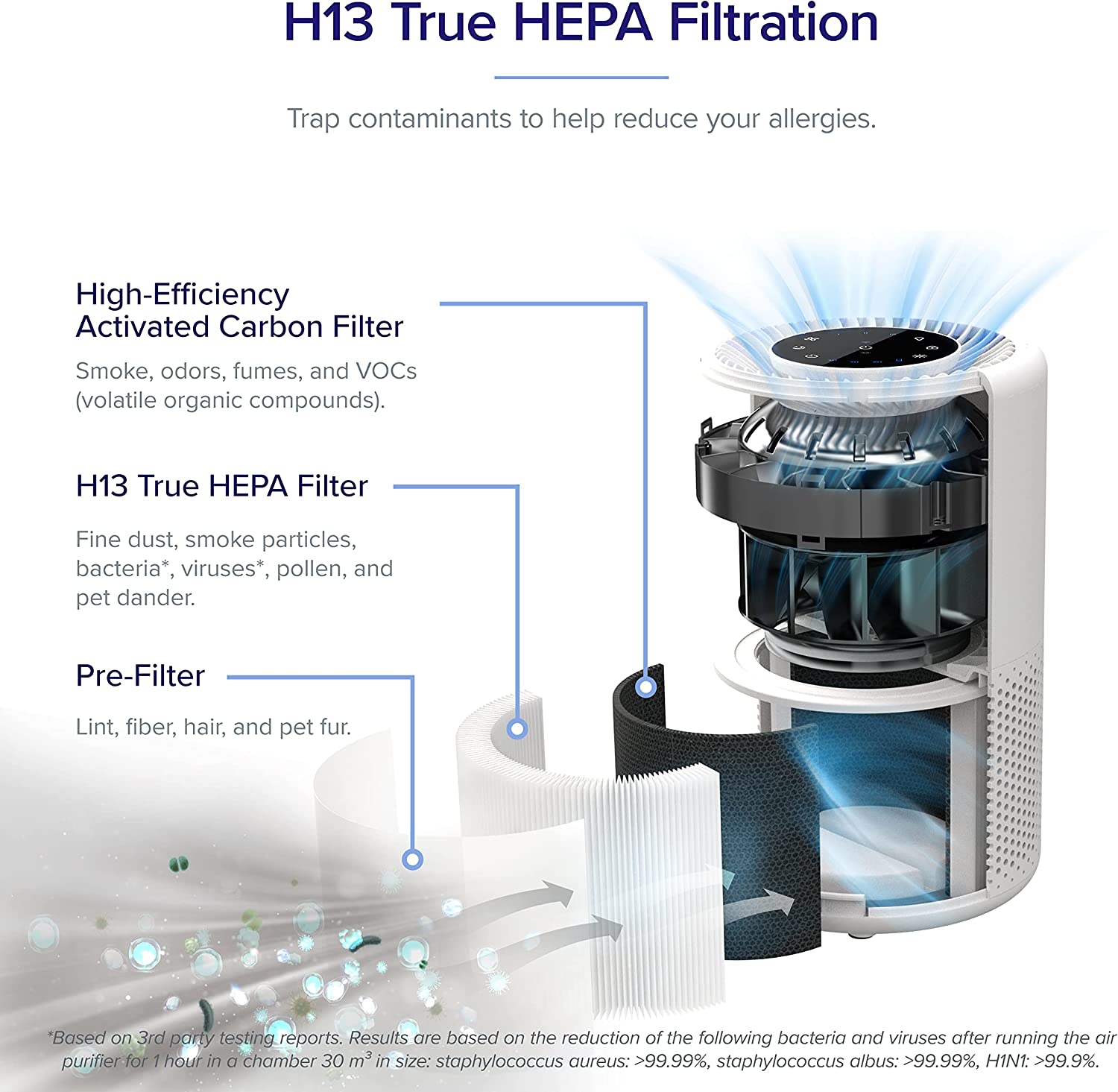 • IMPROVED FILTRATION: While the ultra-fine Nylon Pre-Filter and High-Efficiency Activated Carbon Filter capture large particles and absorb odors and fumes, the H13 True HEPA Filter captures 99.97% of airborne contaminants 0.3 microns in size, ridding your environment of dust, pollen, pet dander, mold spores, and more