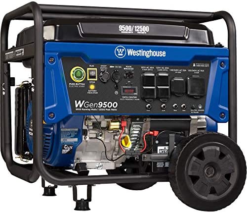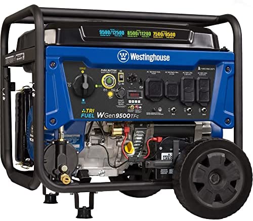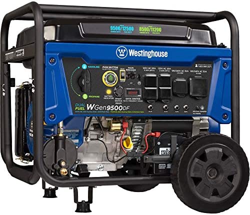 The Westinghouse WGen9500DF Dual Fuel Portable Generator produces up to 12,500 peak watts and 9,500 running watts. The WGen9500DF is a dual fuel generator that operates on gasoline or propane (LPG). The heavy duty 457cc 4-Stroke OHV Westinghouse Engine is constructed of a durable cast iron sleeve and runs for up to 12 hours on a 6.6 gallon (25 L) gas tank, keeping you powered through the day with built-in fuel gauge, automatic low oil shutdown, and GFCI outlets. Push-Button Electric Start makes starting the WGen9500DF effortless while the remote start key fob offers added ease from a distance. Its intuitive control panel spotlights the Transfer Switch Ready L14-30R and larger 14-50R to power your major appliances like the air conditioner, refrigerator, and sump pump as well as any lights or entertainment centers all at the same time with a single cord hookup. VFT Data Center displays volt output, frequency, and lifetime hours to keep you up to date with real-time information and regular maintenance. Conveniently portable with an included set of heavy duty never-flat wheels, handle, and lift bracket, it'll have your house, travel trailer, or jobsite powered in seconds. The WGen9500DF is complete with a 3-Year Limited Warranty and Lifetime Technical Support backed by our nationwide customer service and support network.