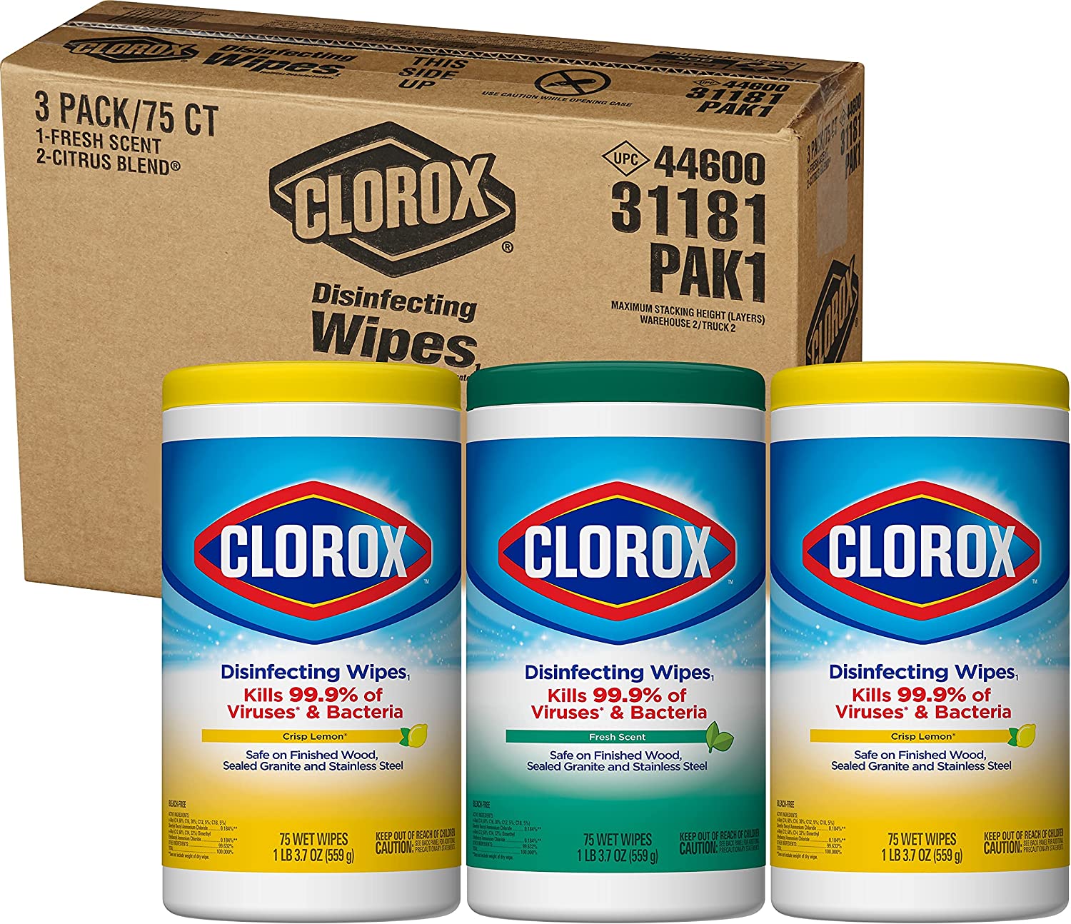 Clorox Disinfecting Wipes, Bleach Free Cleaning Wipes, Multi-surface Wipes, Fresh Scent & Crisp Lemon Value Pack, 75 Wipes (Pack of 3) - Packaging May Vary
