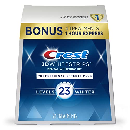 Want to your whiten teeth at home? Crest 3DWhitestrips Professional Effects Plus offering that features 20 Professional Effects treatments and 4 bonus 1 Hour Express treatment and is designed to whiten like a professional-level teeth whitening treatment at-home. The Advanced Seal Technology's comfortable, no-slip grip means the strips stay put until you take them off, allowing you to talk and even drink water while whitening your teeth. Made by the #1 dentist-recommended at-home teeth whitening brand, Crest 3DWhitestrips Professional Effects Plus will give you a 100% noticeably whiter smile, guaranteed. Using the same hydrogen peroxide whitening ingredient as dentists, this enamel safe at-home teeth whitening kit will make your teeth 23 levels whiter. Simply apply 20 treatments of Crest 3DWhitestrips Professional Effects Plus for 45 minutes a day and 4 treatments of 1 Hour Express for 60 minutes. This pack includes 48 teeth whitening strips, 24 for your top teeth and 24 for your bottom teeth, to be used over the course of 24 days.