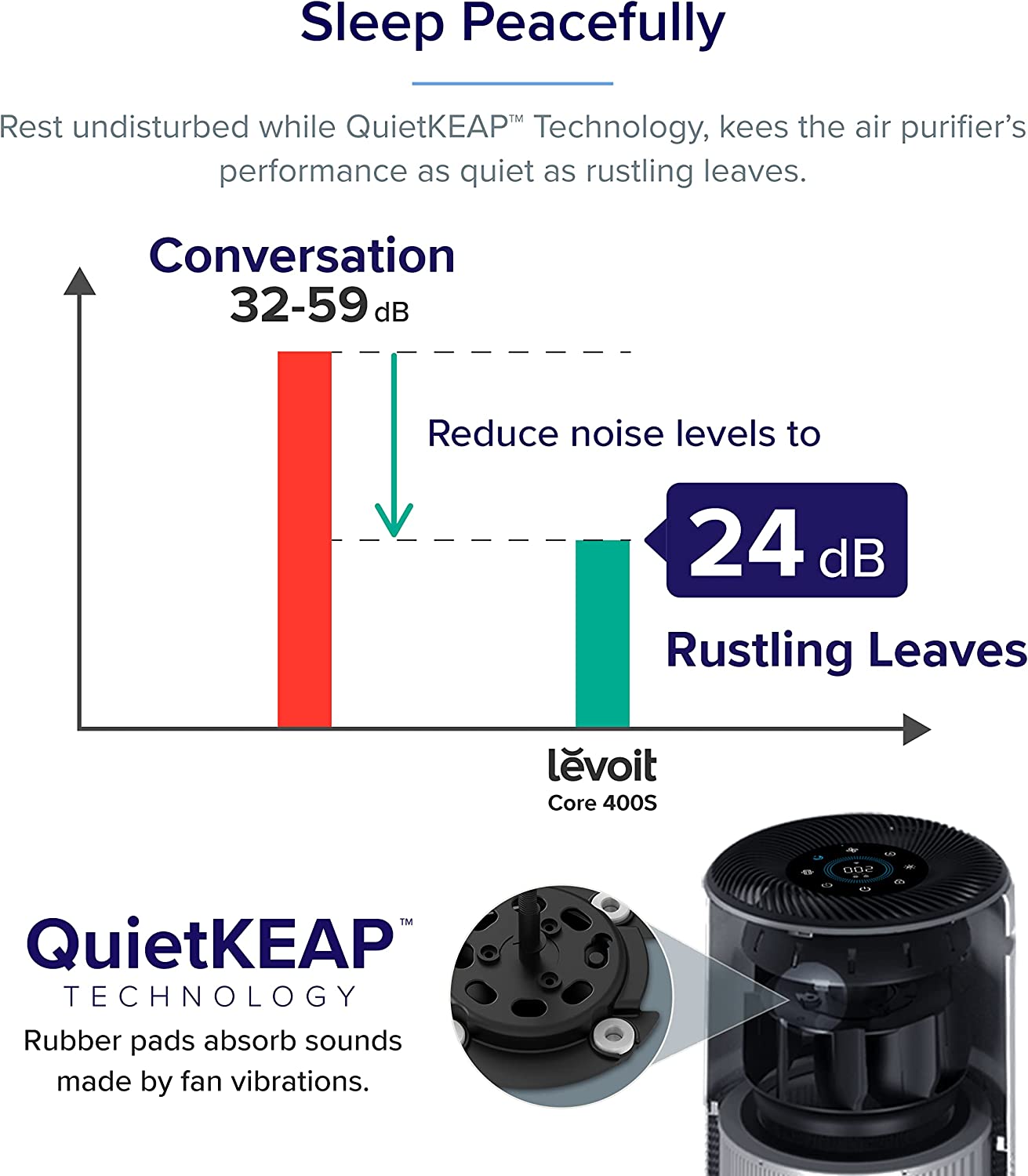 • WHISPER-LEVEL QUIET: Keep the Core 400S running throughout the night, as Sleep Mode uses the lowest fan speed (24dB) to create a sleep-friendly space that’s as quiet as falling leave