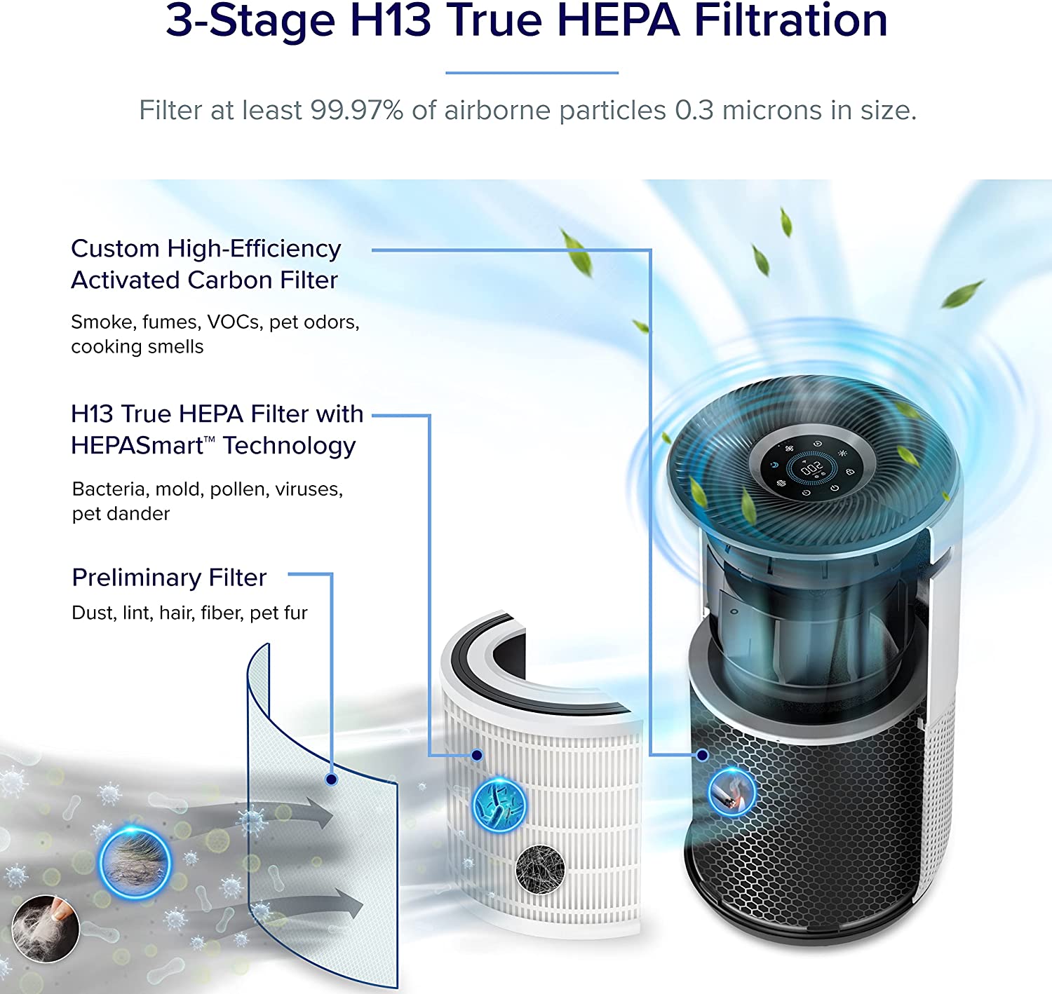 • 3-STAGE FILTRATION: Filtration includes a Pre-Filter, H13 True HEPA Filter, which traps viruses, bacteria, pollen,dust, and pet dander, and a Custom High-Efficiency Activated Carbon Filter that helps neutralize odors, cooking and wildfire smoke, and VOCs