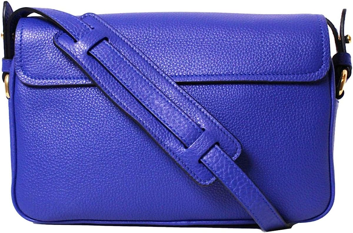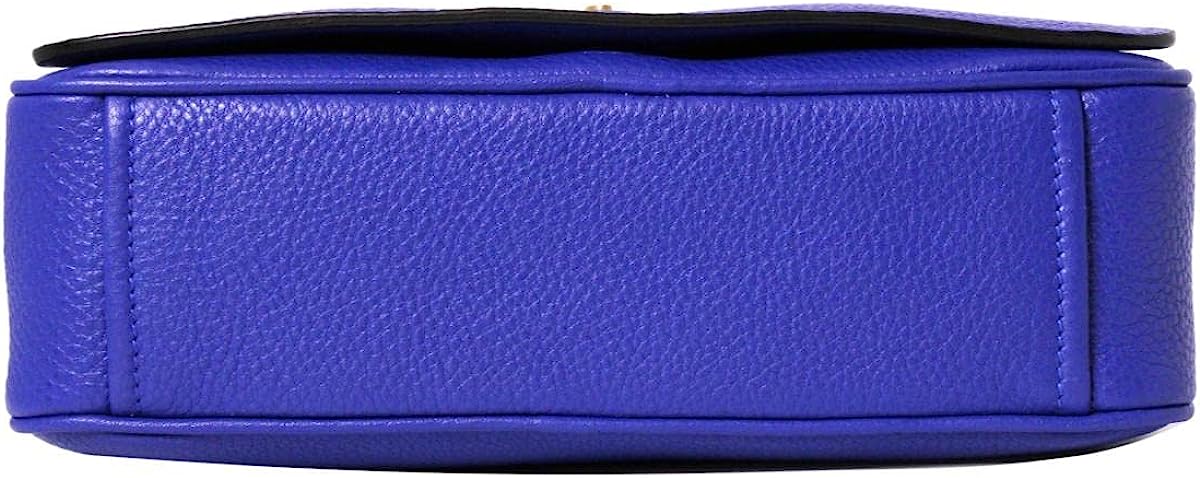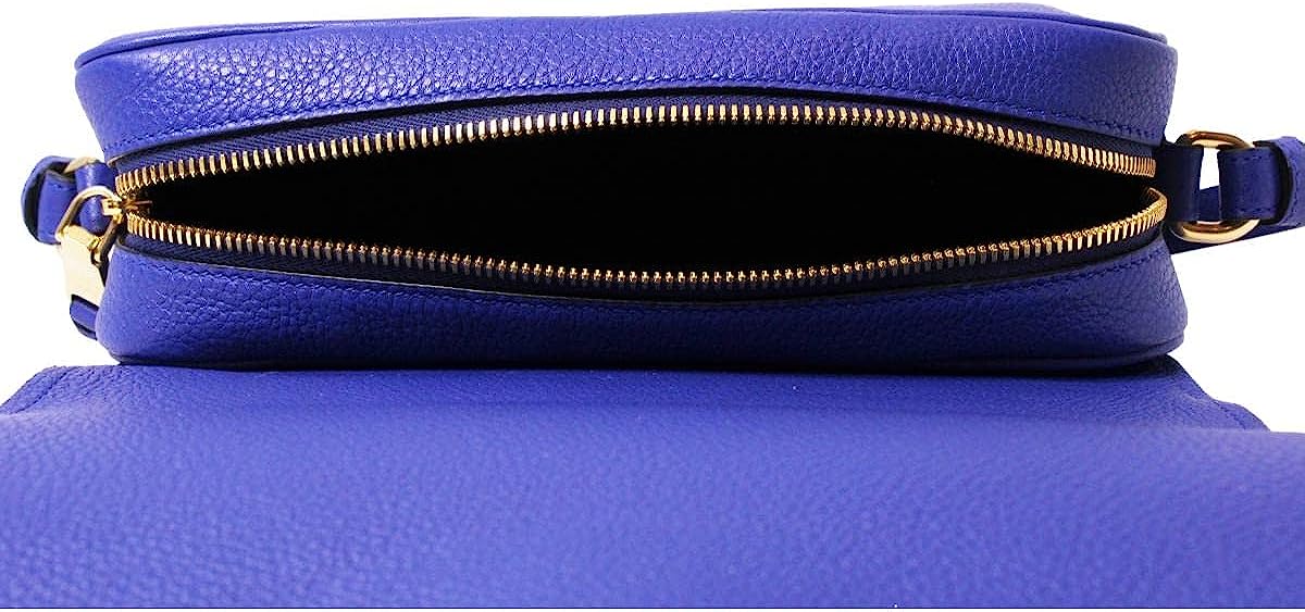 • Color: Royal Blue. Material: Calf Leather. Gold-tone Hardware. Magnetic flap fastening. Zipper fastening. Interior black jacquard lining. One interior slip pocket.